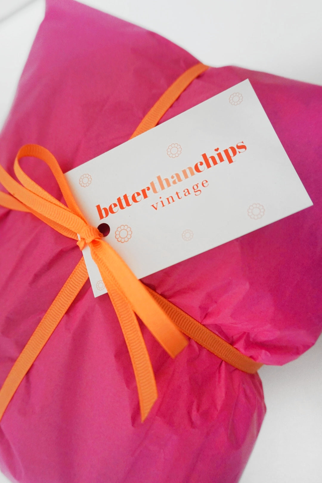 Your Better Than Chips Vintage purchase will be cleaned, steamed and wrapped beautifully in tissue paper with a ribbon and personalised note. This is inspired by the department stores of old, where every purchase was gorgeously wrapped like a gift!