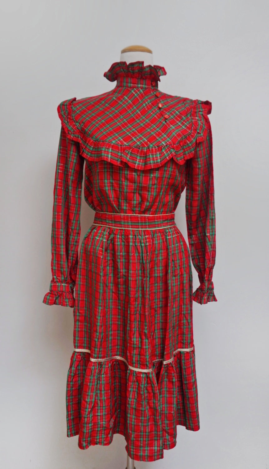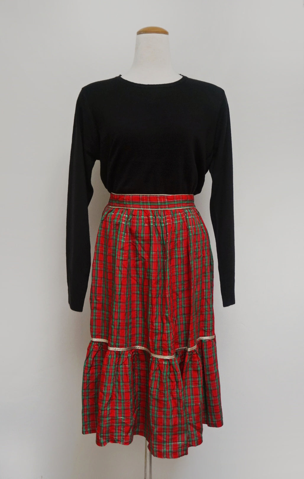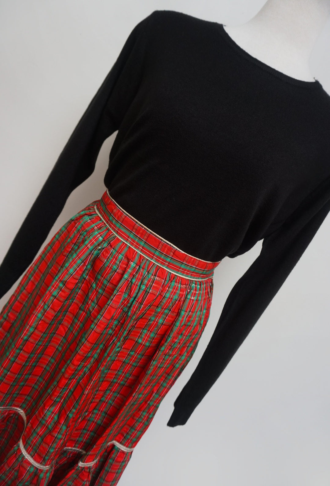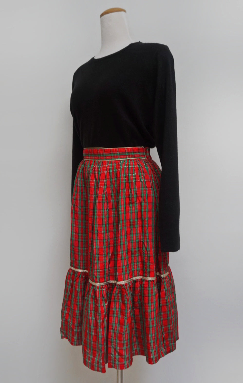 The cutest little 1970s prairie skirt! This piece is handmade from a red and green micro tartan and features a high waist and gold trim. The shape is fit and flare and it falls mid-calf.