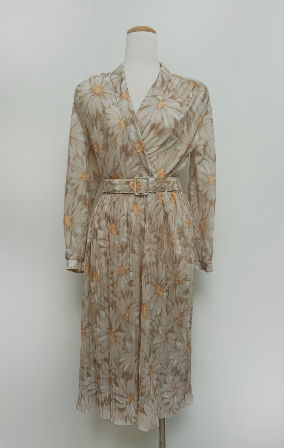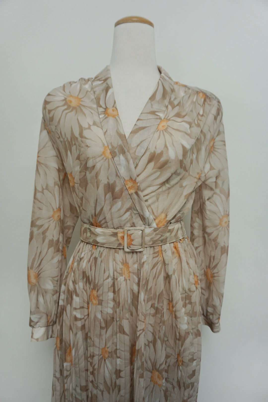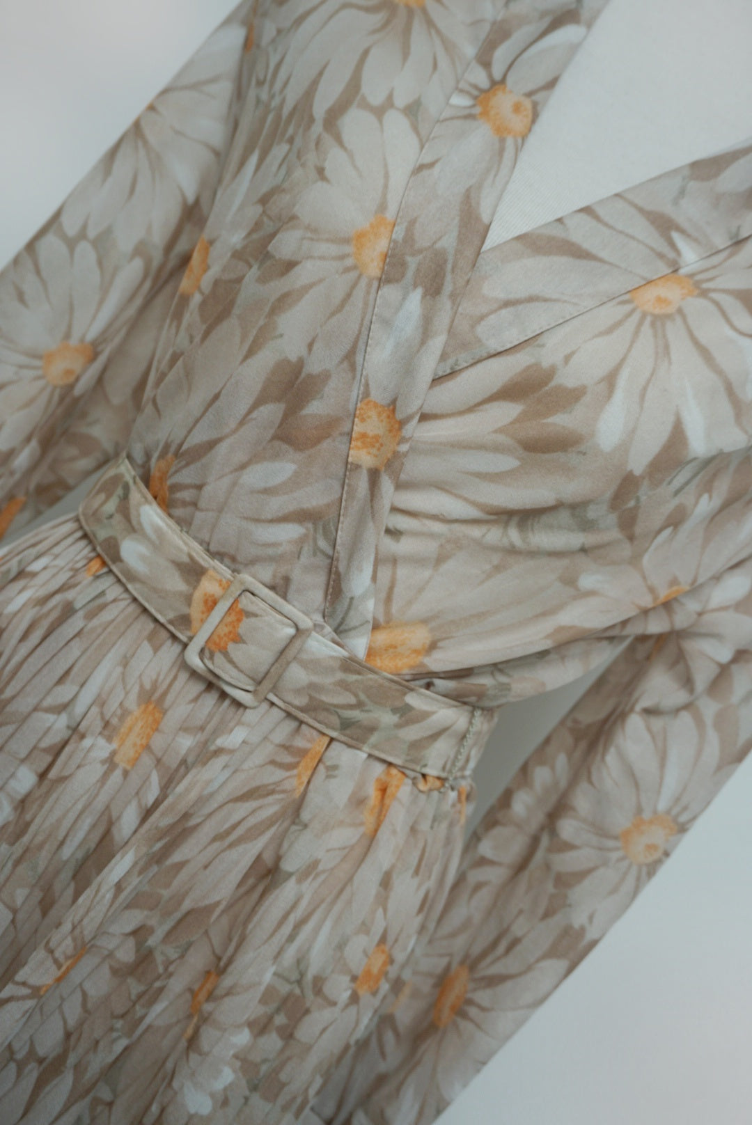 Stunning vintage 1970s crossover floral dress with matching fabric belt. Sheer-ish fabric (but not flimsy - quite a strong fabric) - if worn without tights requires a slip (any inexpensive slip will do the job!)