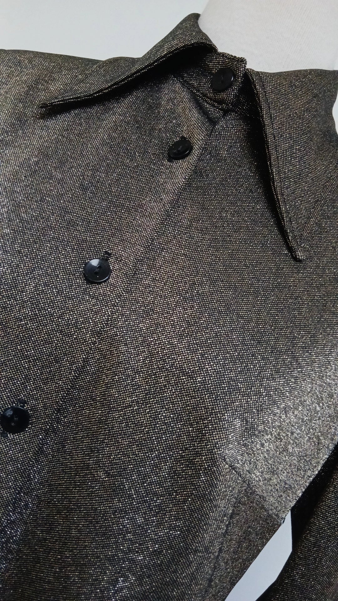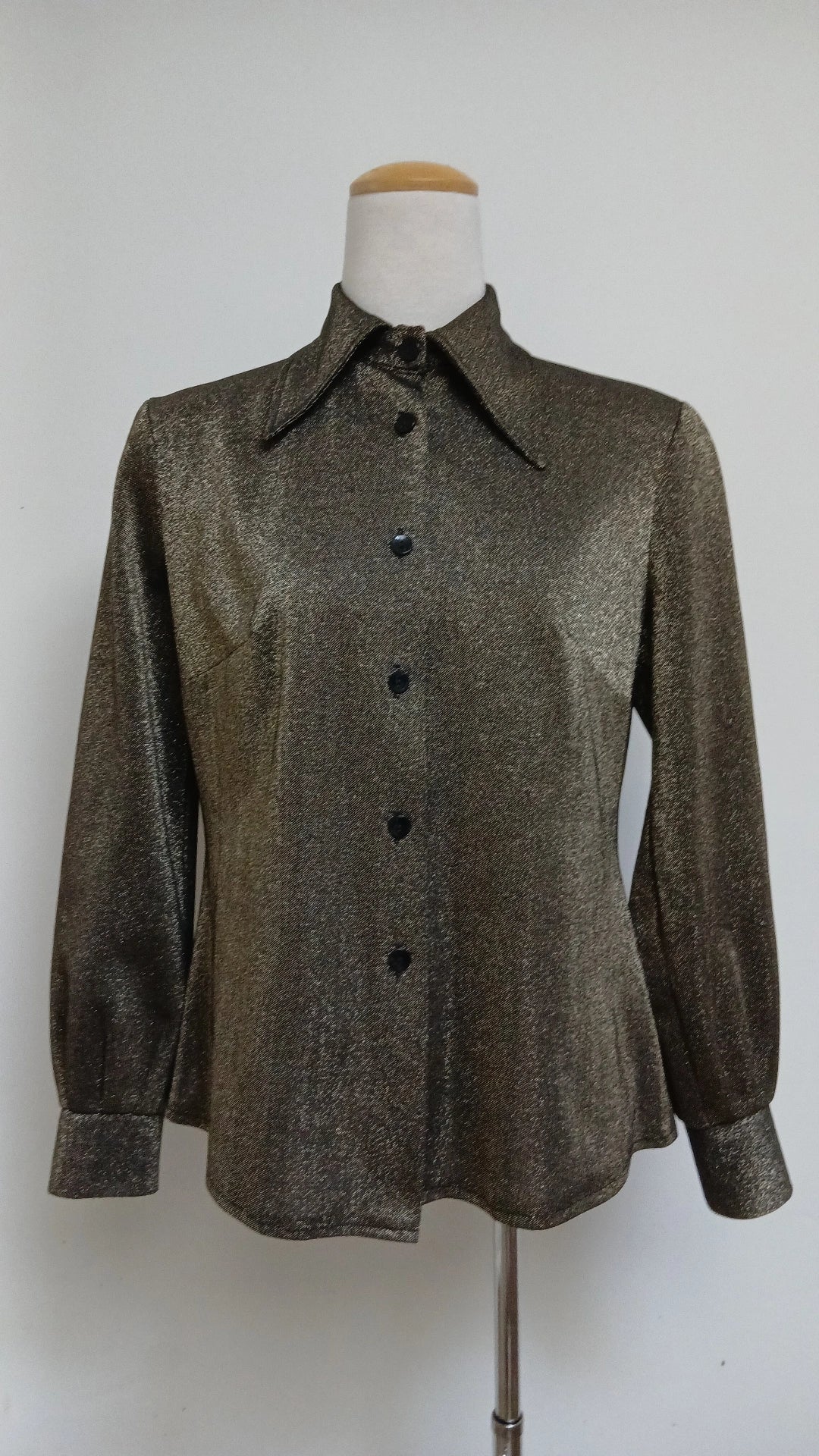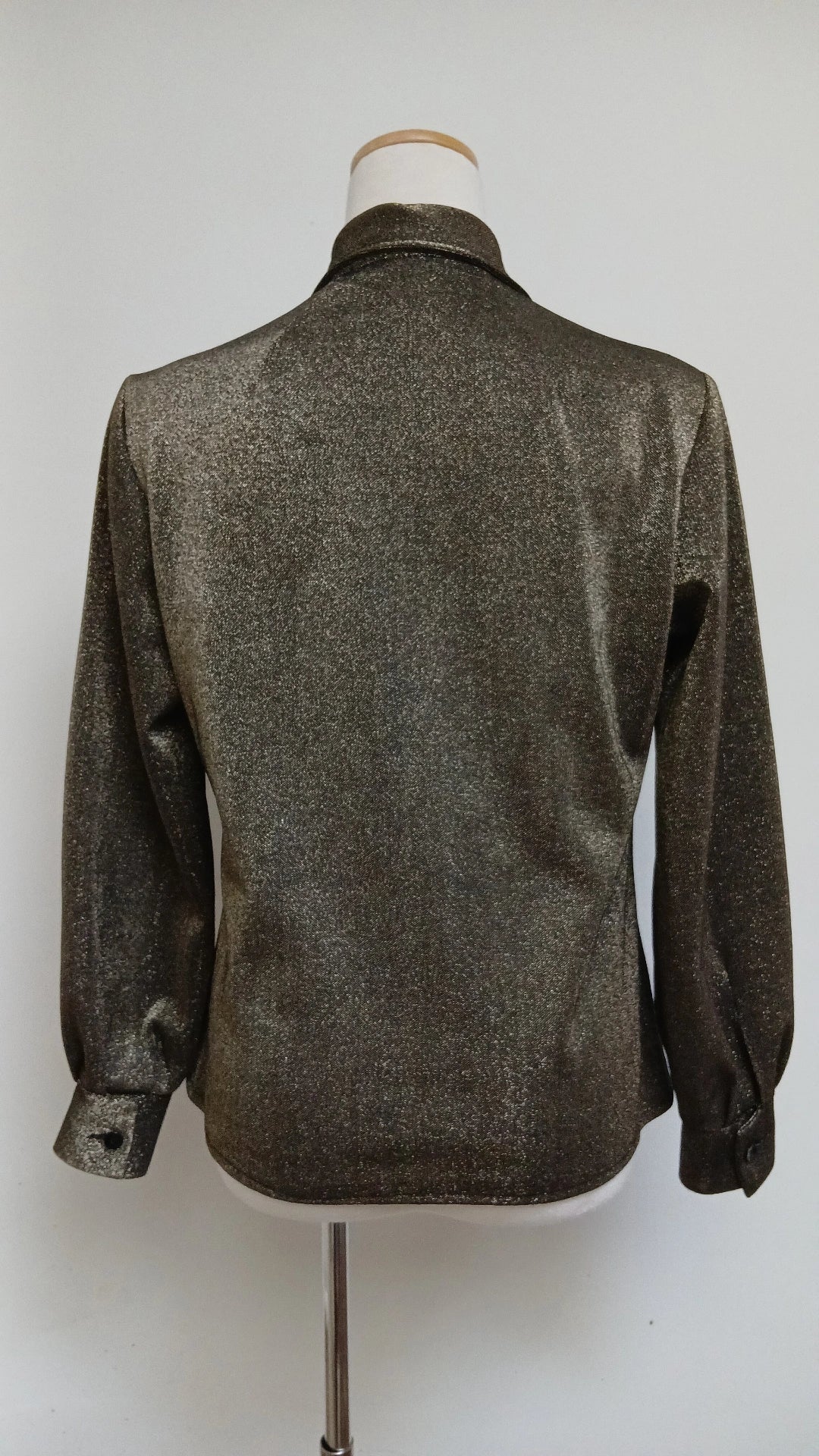 Fabulous quintessential 1970s blouse. Grey with an all over sparkle. Features dagger collar and button cuffs.